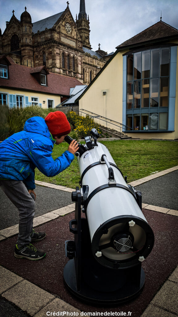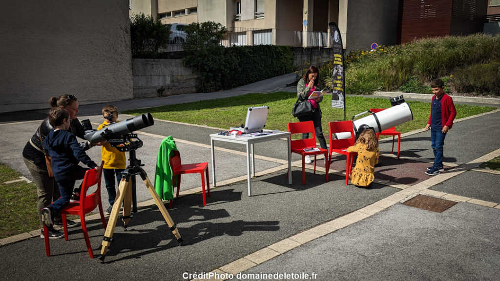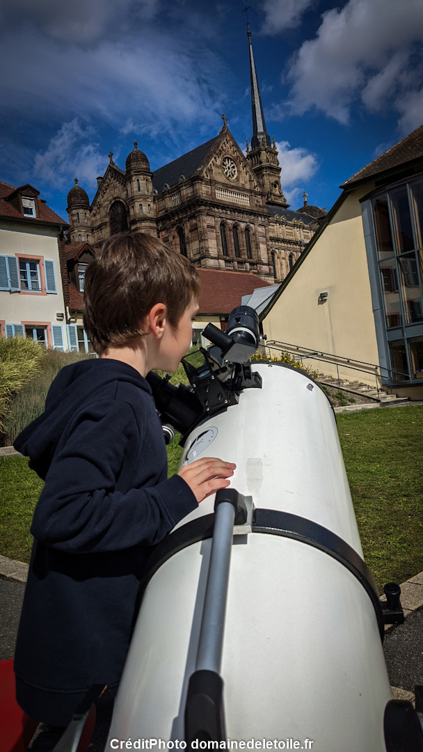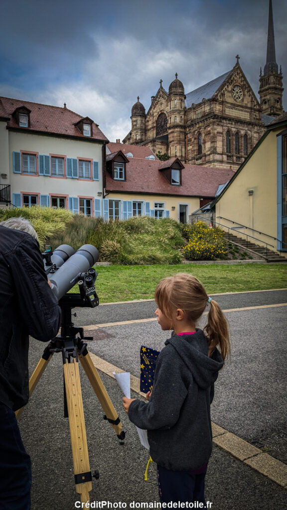 L’idée ? Installer mes télescopes et jumelles non pas pour observer le ciel… mais pour découvrir autrement le patrimoine de notre ville. Placés au pied du magnifique édifice de l’église Saint-Maimbœuf, les instruments ont permis aux visiteurs de porter un autre regard sur son architecture.